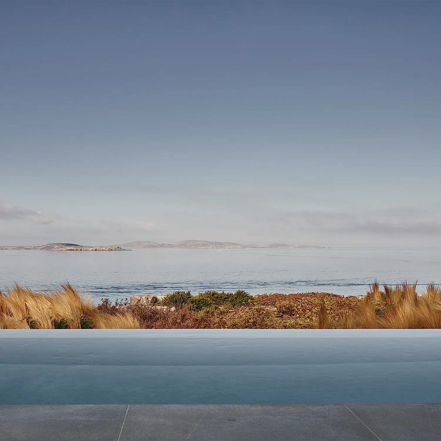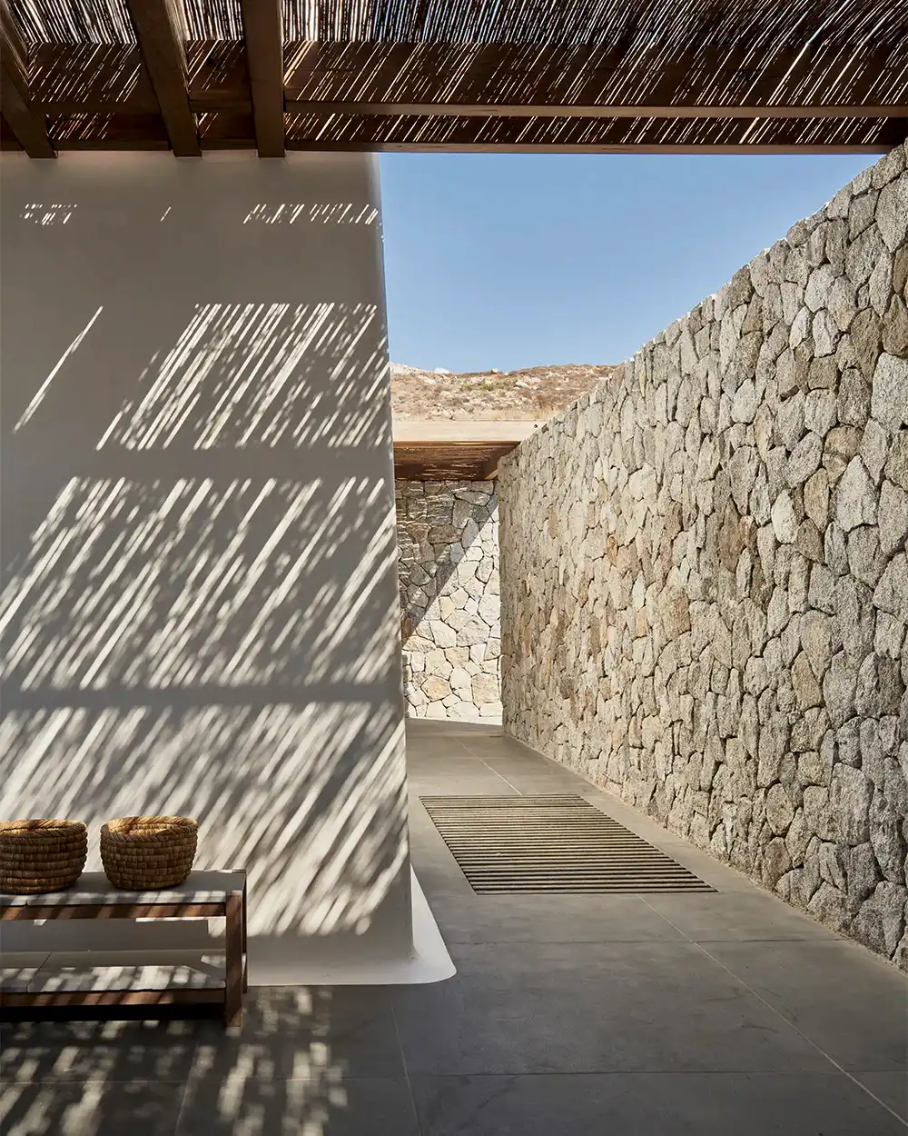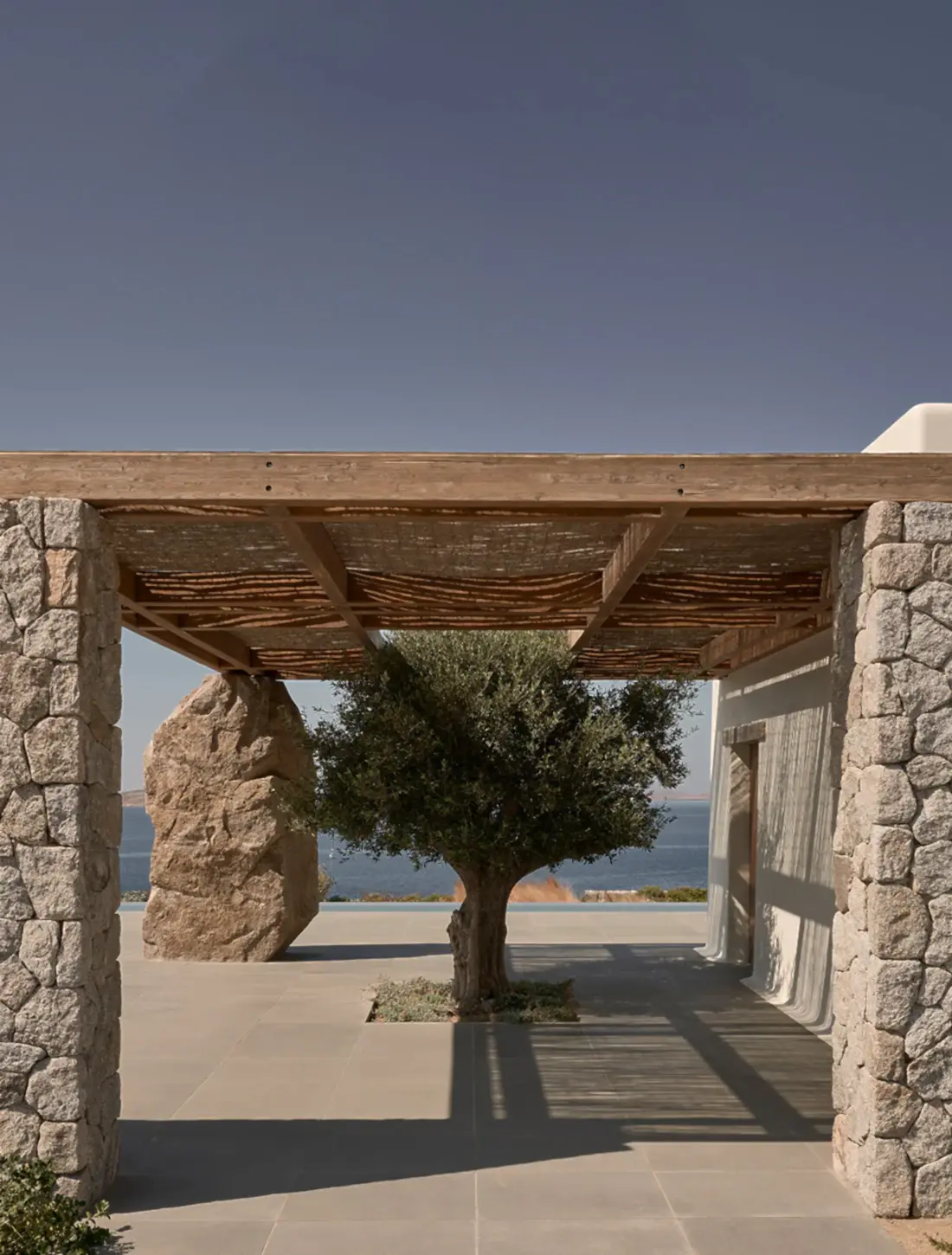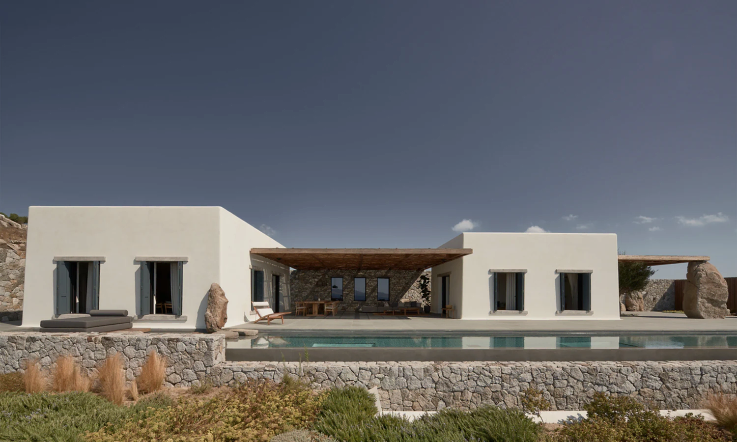 The architecture consists of two small, traditionally whitewashed volumes and a third made of stone quarried from the site, embracing the central courtyard, which is the core of the home. Both are inspired by the humble richness of the Cycladic culture. The bedrooms are placed under the pool area, away from the noise and bustle, and they have a wonderful view. Their separation lessens the house's overall impact and clearly defines public and private areas.