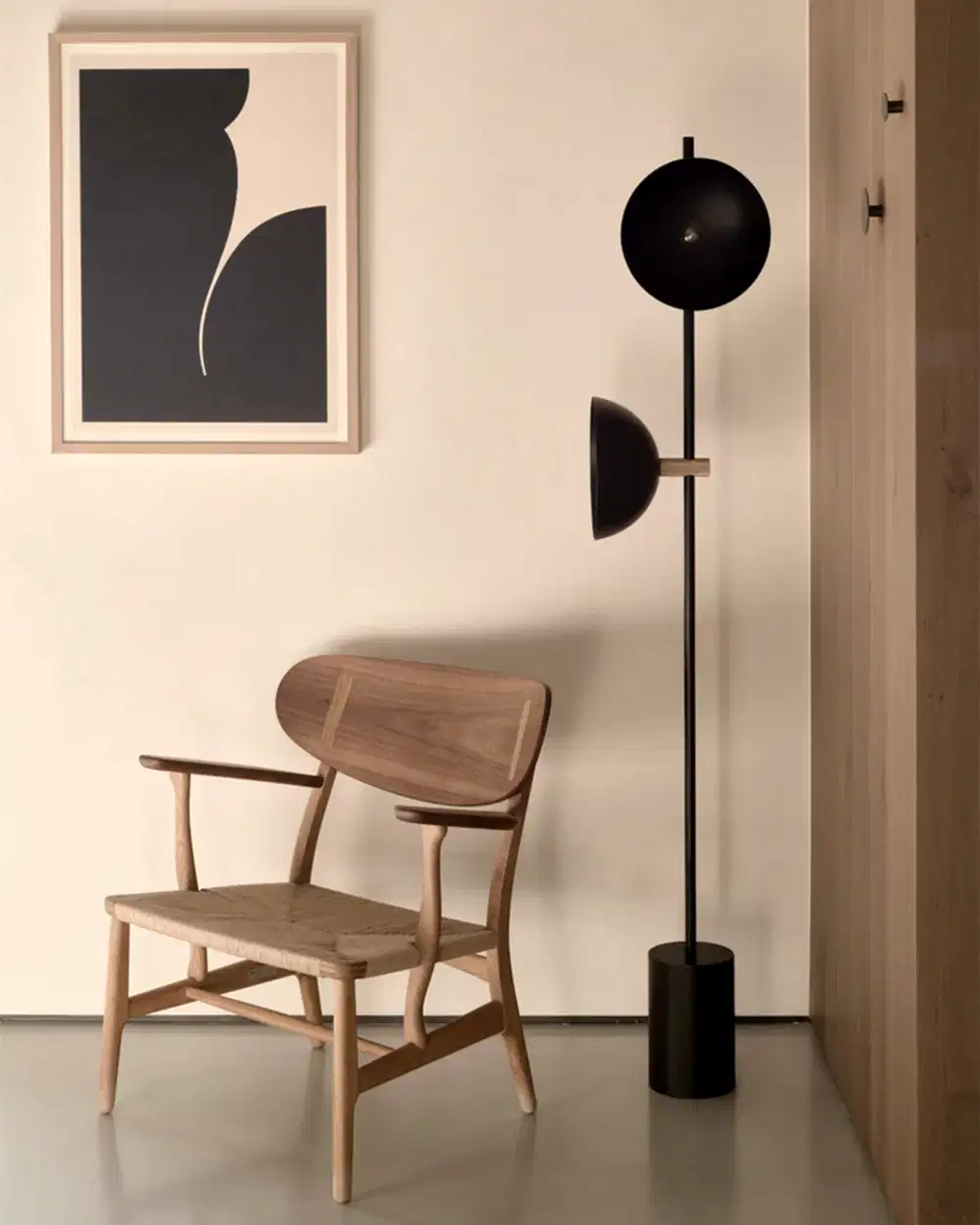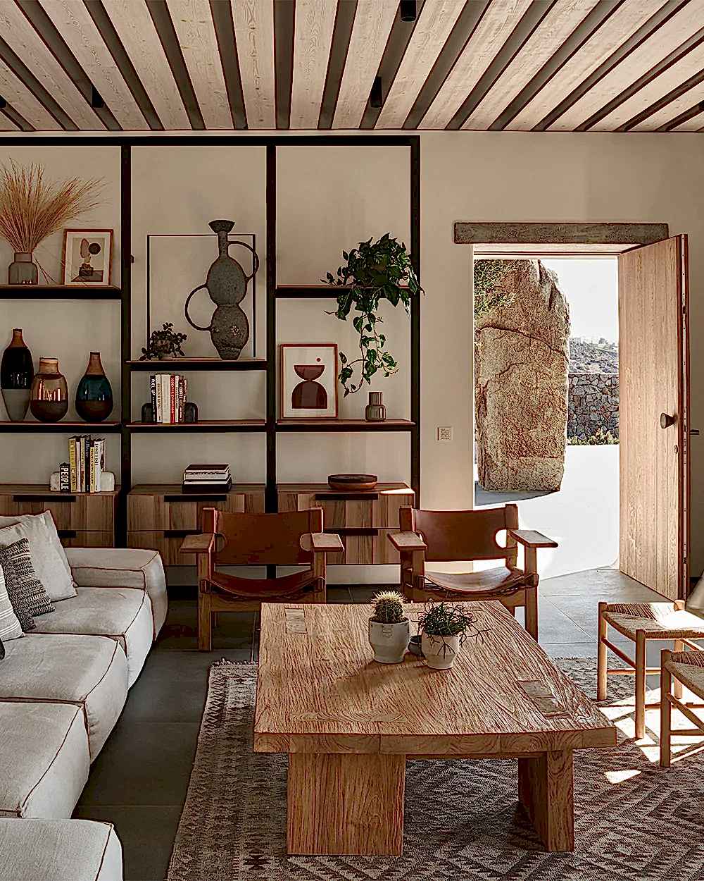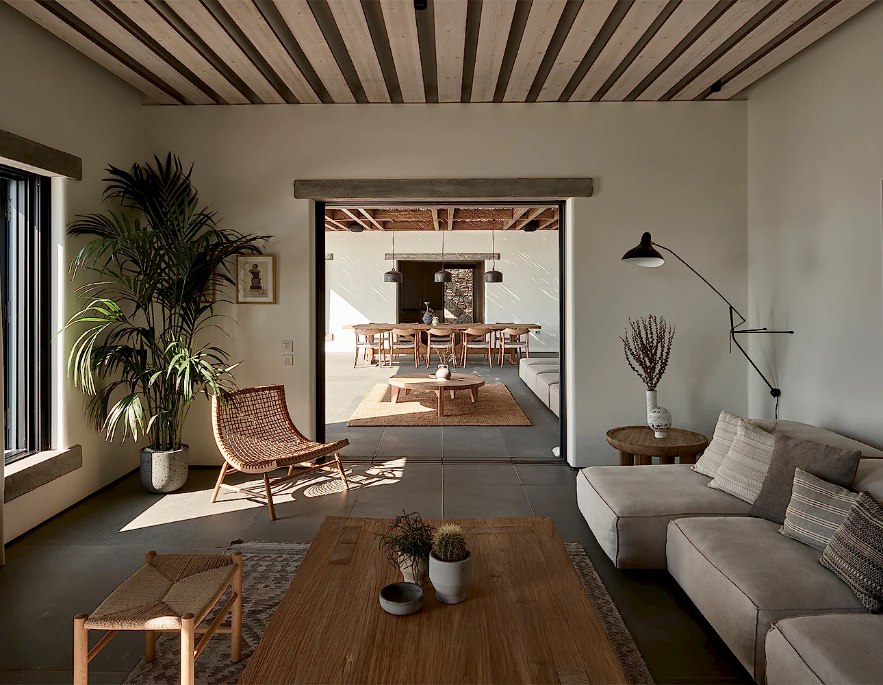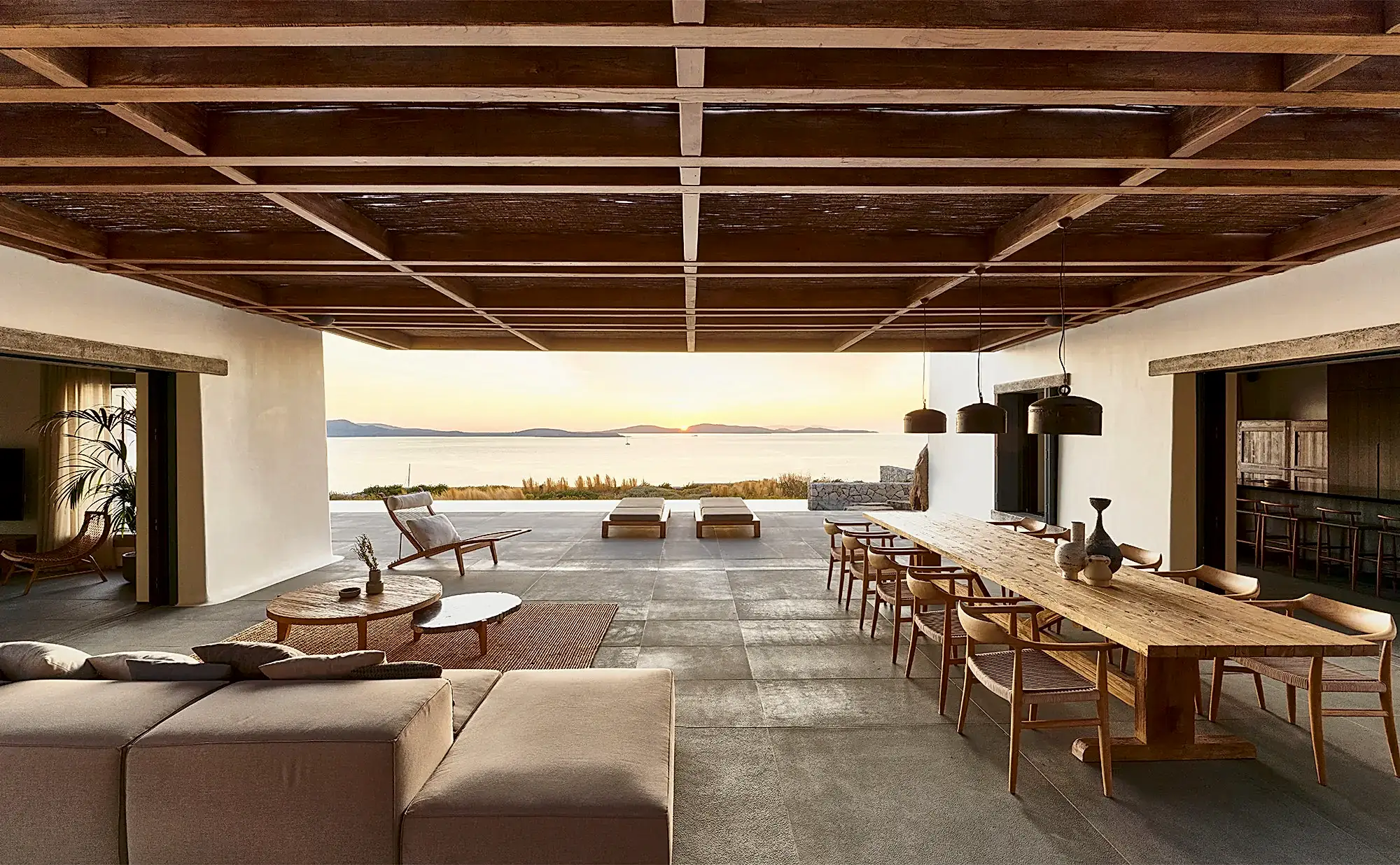 The central courtyard, with views of both the pool and the Aegean Sea and shaded by an expansive chestnut pergola, is decorated for outdoor dining with a large wooden dining table by Giorgos Kapraras lying beneath pendant lighting dangling from the rafters. The living area is furnished with large sofas upholstered in a light grey fabric and scattered with monochromatic cushions in a variety of textures and patterns, and low wooden tables and chairs have been arranged next to them. In the kitchen, the courtyard arrangement for community meals is replicated with another wooden dining table piece. Plants and ceramic sculptures adorn the interior, contributing to the laid-back and natural ambiance that pervades the space.