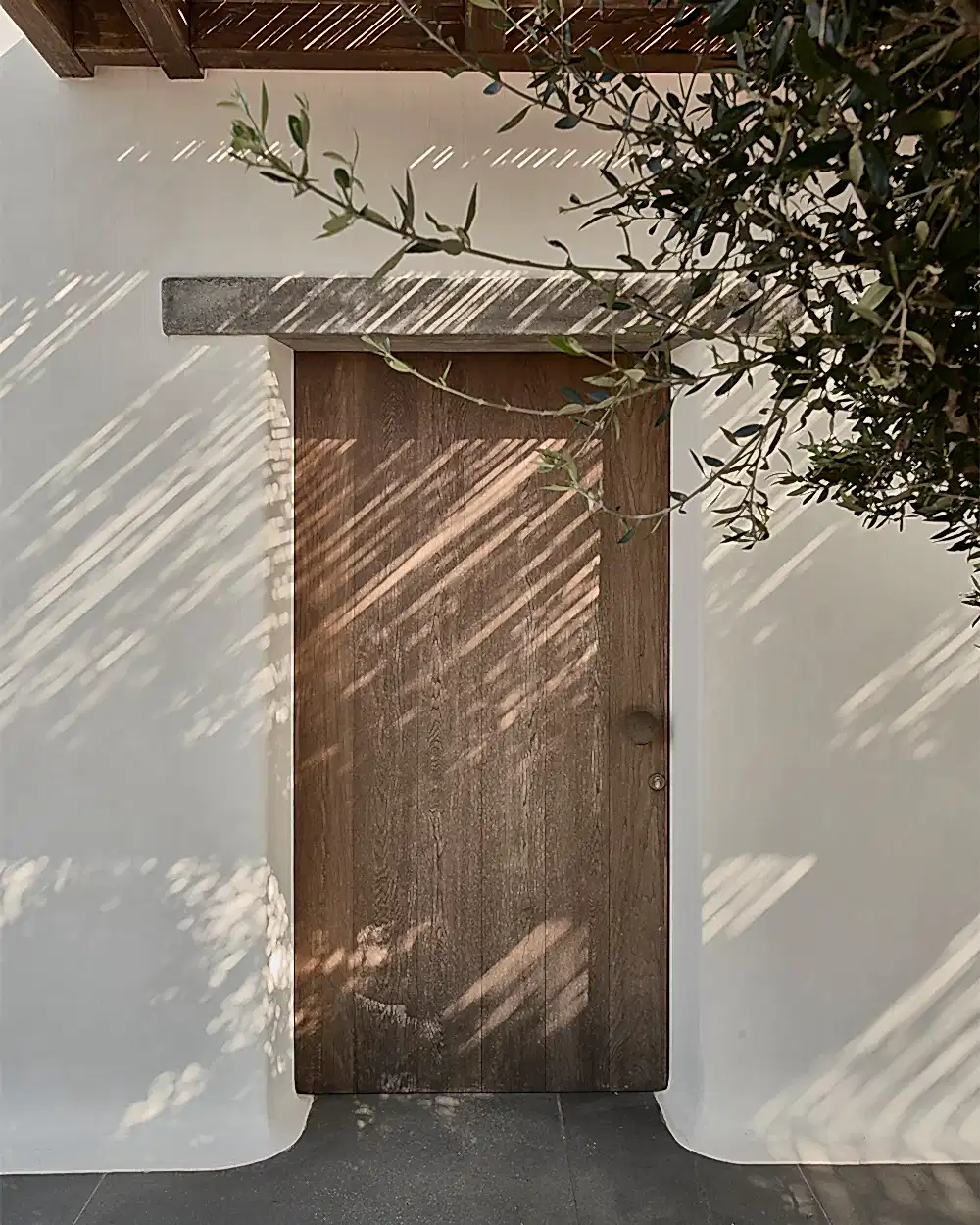The walls that surround the Villa Mandra are left natural to blend with the landscape, while the living room and kitchen units are built with lime-washed walls to contribute to the clean and minimalist design. A small olive tree welcomes you on the patio as you enter the house through the main entrance; it is let to grow freely through a cut-out in the sunshade, which is supported at the outer corner by a solid rock dug from the site.