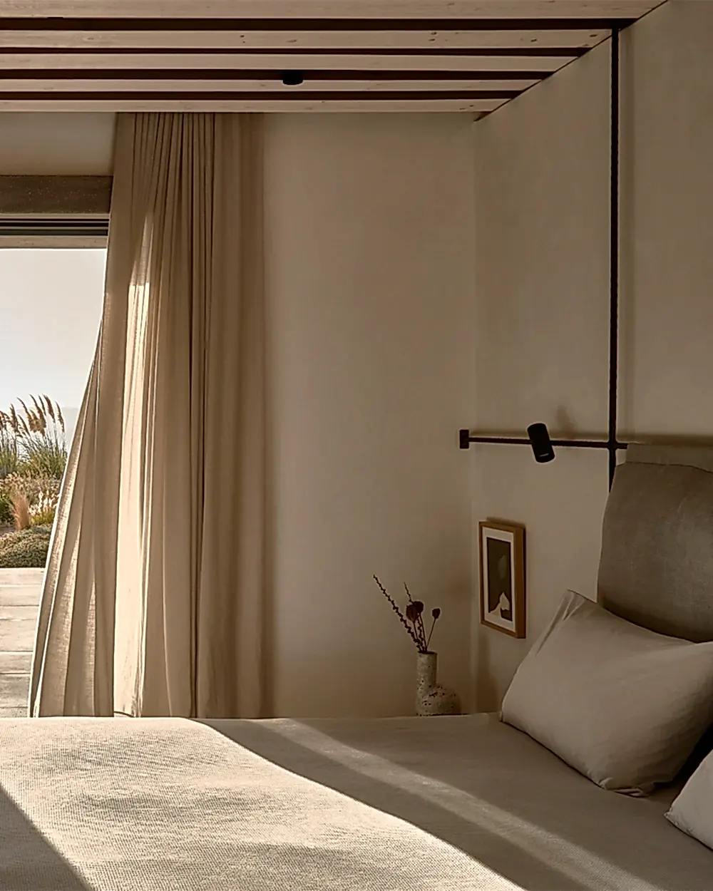 The bedrooms are carefully placed below the central courtyard, providing quiet living quarters for the inhabitants. In each bedrooms, a headboard has been created using neutral linen stretched tightly between bronze rods. The cabinets that make up the bedside tables are constructed of wood and supported by stone niches.