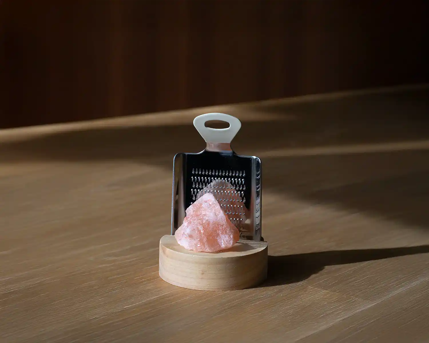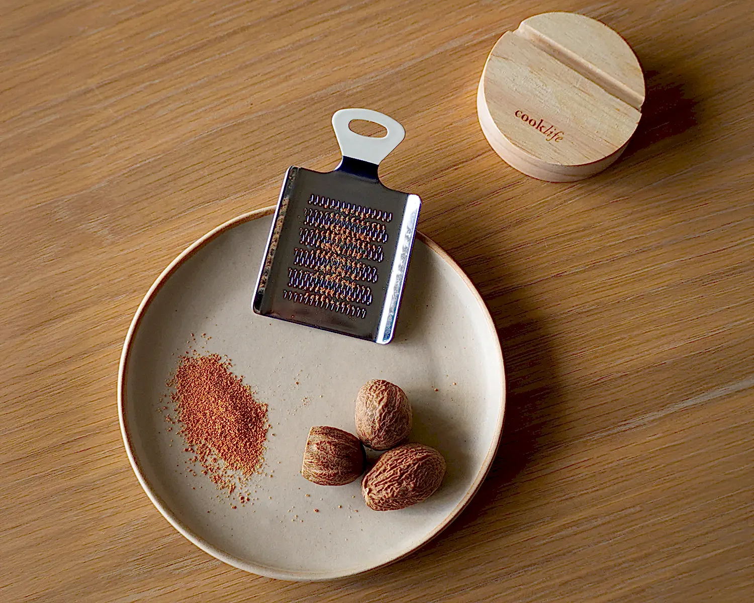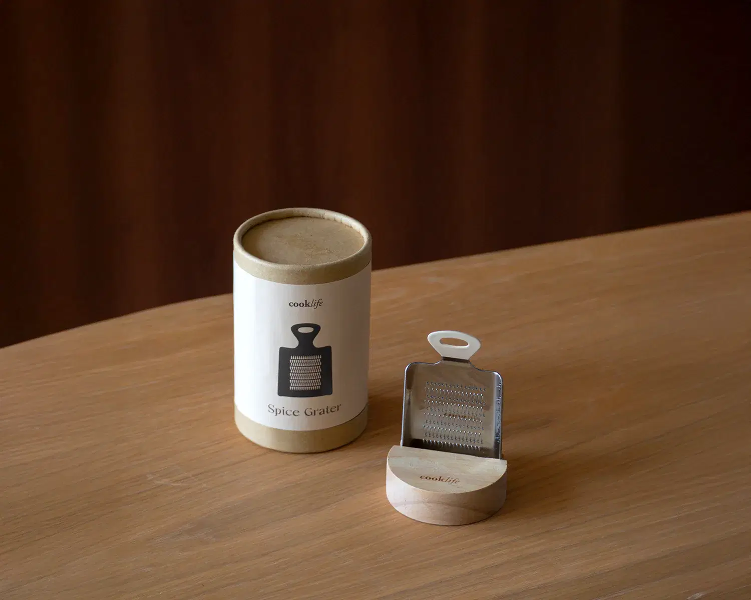 Crafted with a stainless steel body and an FSC-certified wooden stand, this grater brings balanced simplicity and quiet function to your kitchen or table.